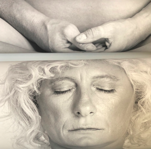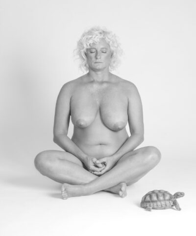 Yo. Desnuda en posición de loto en una foto en blanco y negro y acompañada por una tortuga. Los ojos cerrados me protegen del voyeurismo del espectador. Mi vulnerabilidad desnuda, protegida por mi meditación. Me oculto exhibiéndome.